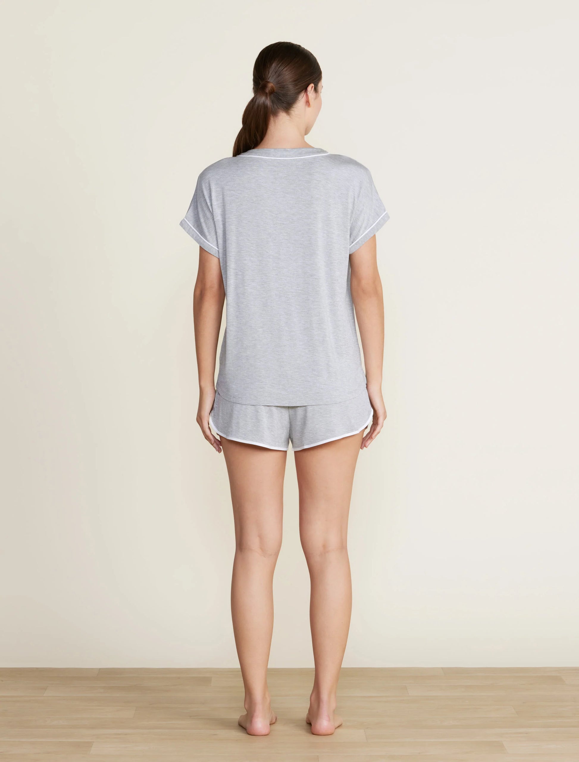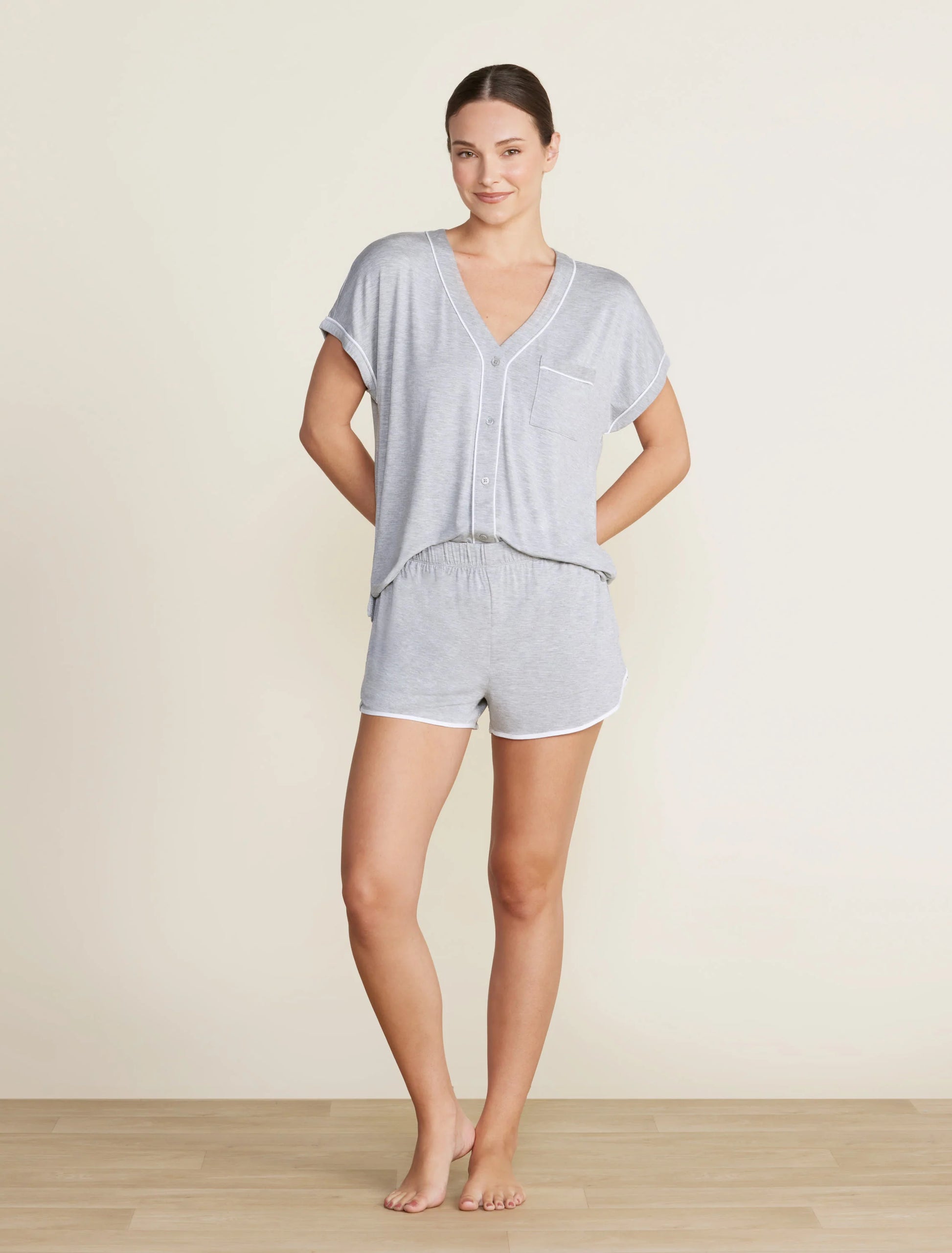 Stay comfortable and stylish while lounging in this Soft Jersey Piped Lounge Set. Featuring a button-down dolman style tee with contrast piping and a patch pocket, and elasticated pull-on shorts with contrast binding at the hemline.